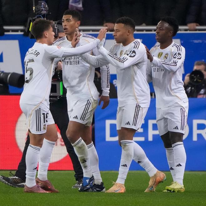 或許是因?yàn)橄抡n輿論帶來的危機(jī)感,這場比賽阿隆索首次將姆巴佩、維尼修斯、貝林厄姆以及羅德里戈四大攻擊手同時(shí)首發(fā)出場;不過阿拉巴,米利唐,門迪,卡瓦哈爾和阿諾德多位后防線球員全部缺席以及阿爾瓦羅停賽,巴爾韋德回撤到防線與勞爾-阿森西奧、呂迪格和青年隊(duì)的巴爾德佩尼亞斯組成了防線,庫爾圖瓦鎮(zhèn)守球門。